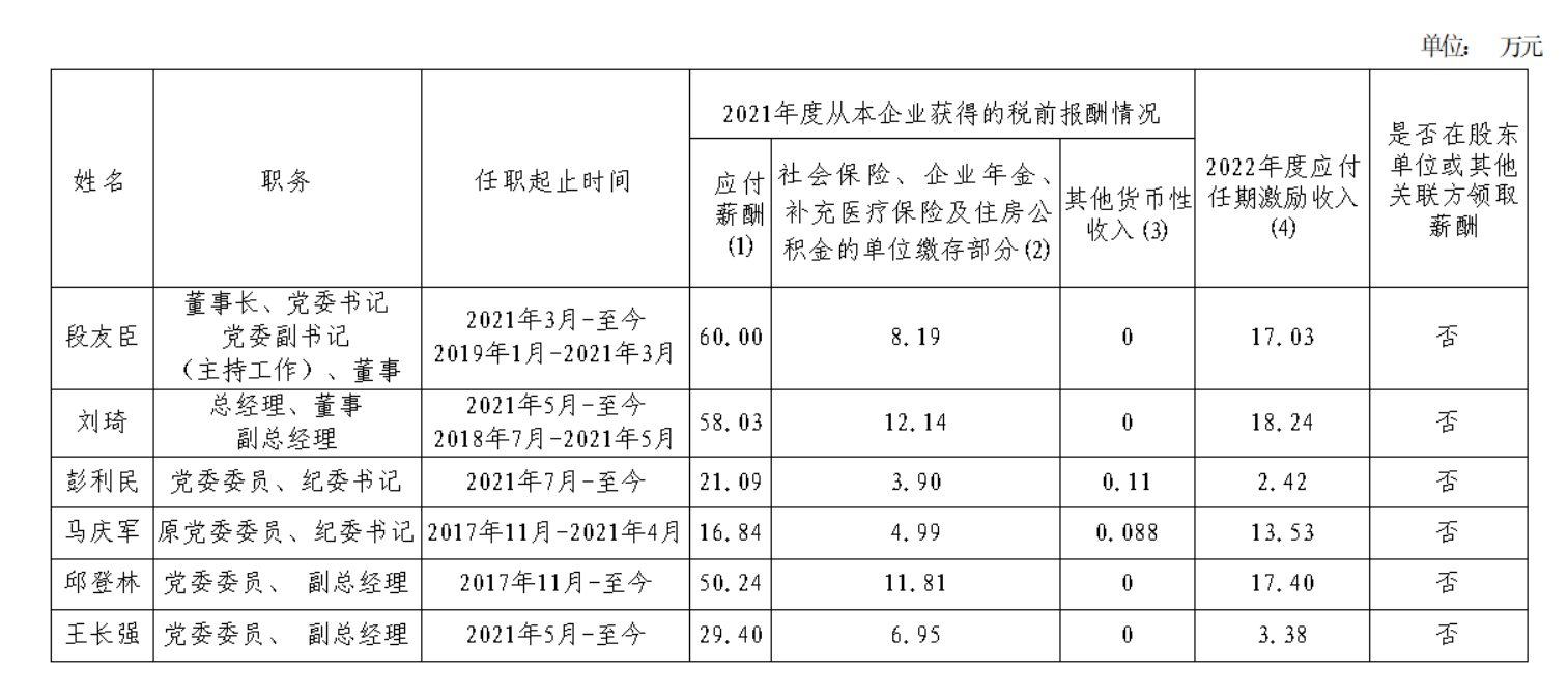 1.上表披露薪酬为我公司企业负责人2021年度全部应发税前薪酬。其中,第(1)(4)项由省国资委核定。