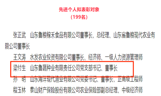 5月22日-23日,省委、省政府召开全省乡村振兴齐鲁样板现场推进会,全面总结和安排部署我省全面推进乡村振兴和加快建设农业强省工作,会上对做出突出贡献的先进集体和个人进行表彰,山东种业鲁蔬公司党支部书记、董事长梁付生被授予“山东省乡村振兴突出贡献奖先进个人”荣誉称号。