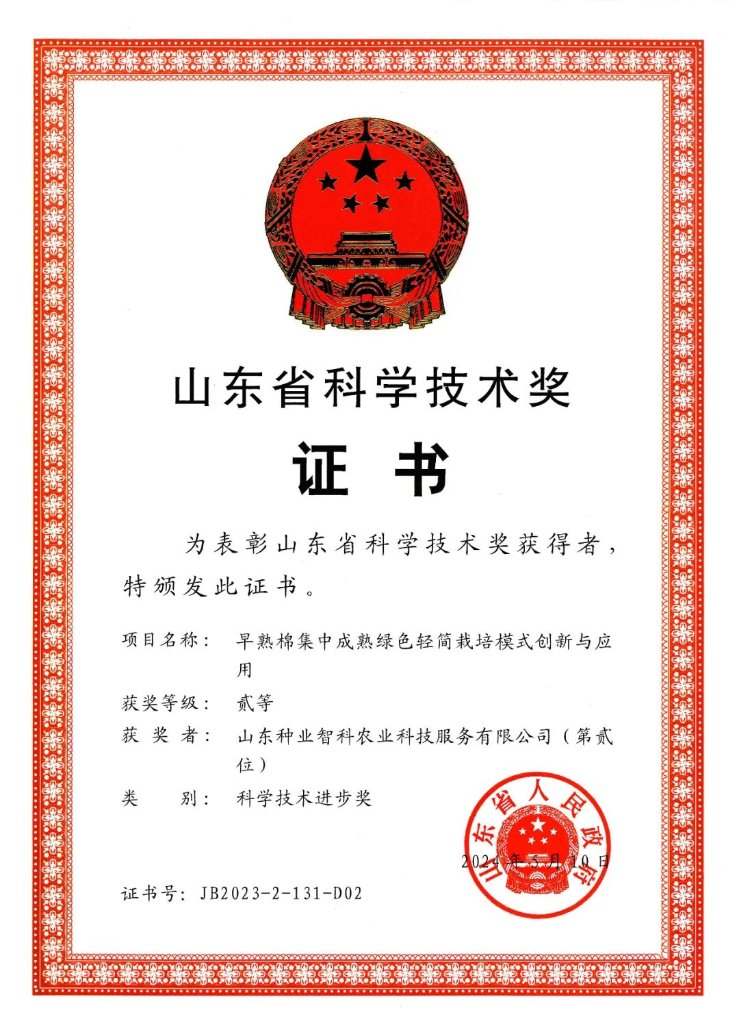 近日,山东省人民政府印发《关于2023年度山东省科学技术奖励的决定》,对为全省科学技术进步、经济社会发展做出突出贡献的科学技术人员和组织给予奖励,山东种业智科农业服务集团有限公司(以下简称智科农服)“早熟棉集中成熟绿色轻简栽培模式创新与应用”项目获山东省科学技术进步奖二等奖。
